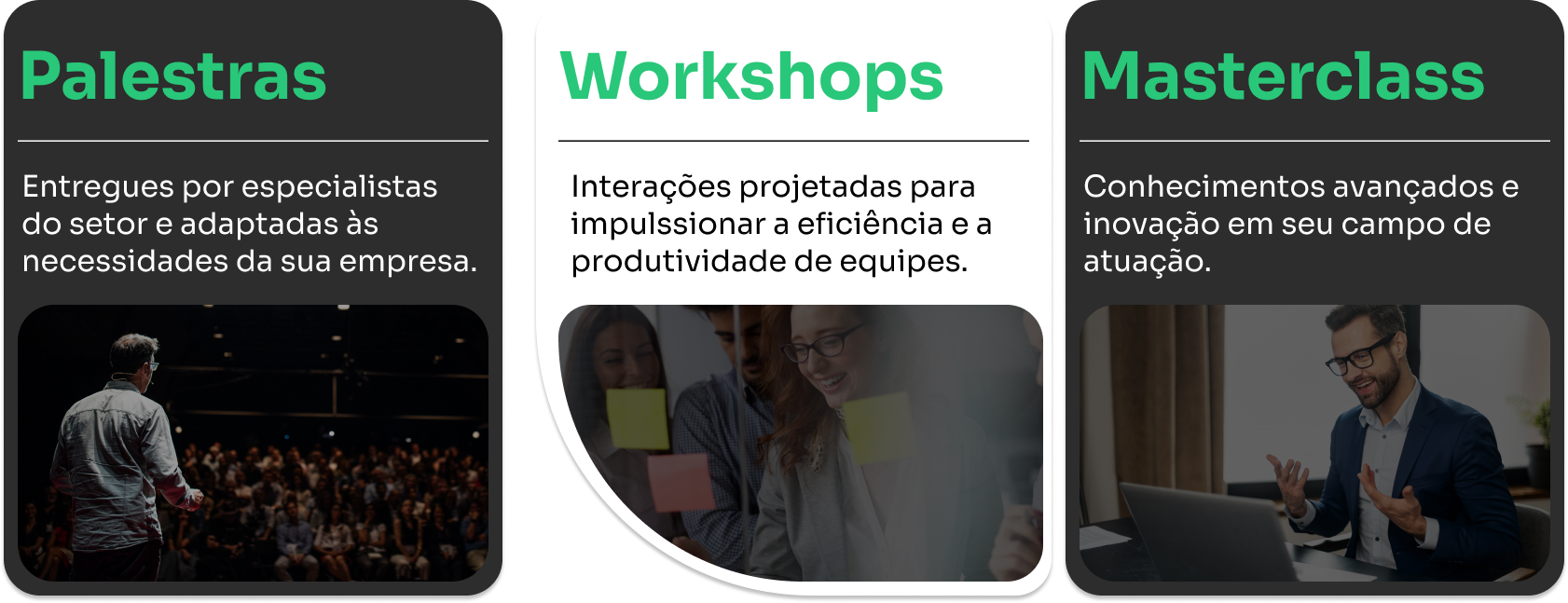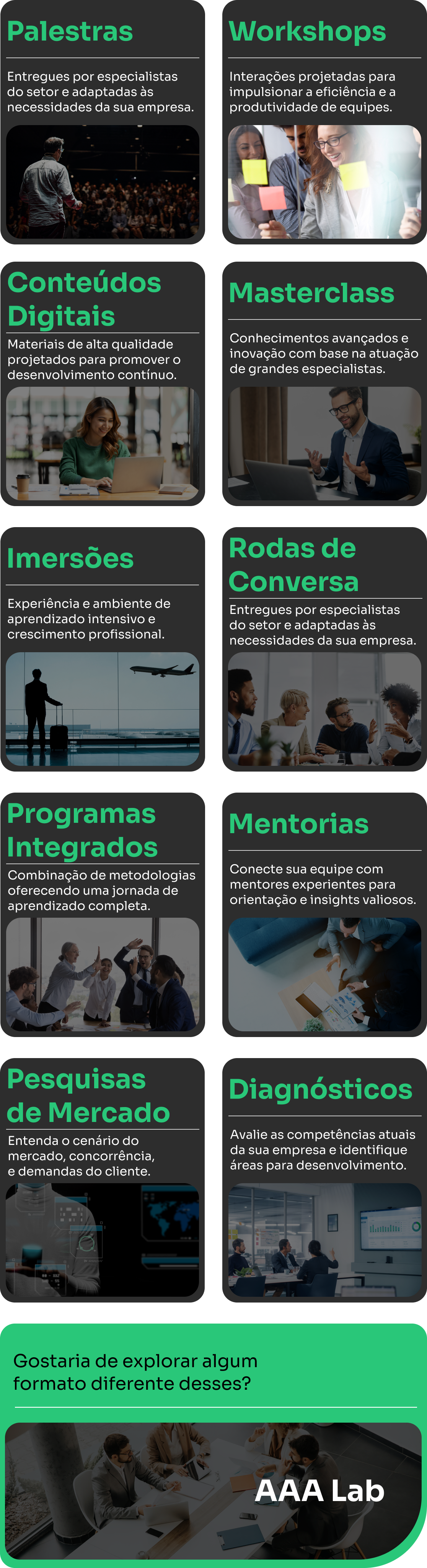 Experiências de inovação corporativa sob medida, projetadas para transformar ideias em soluções inovadoras e práticas.